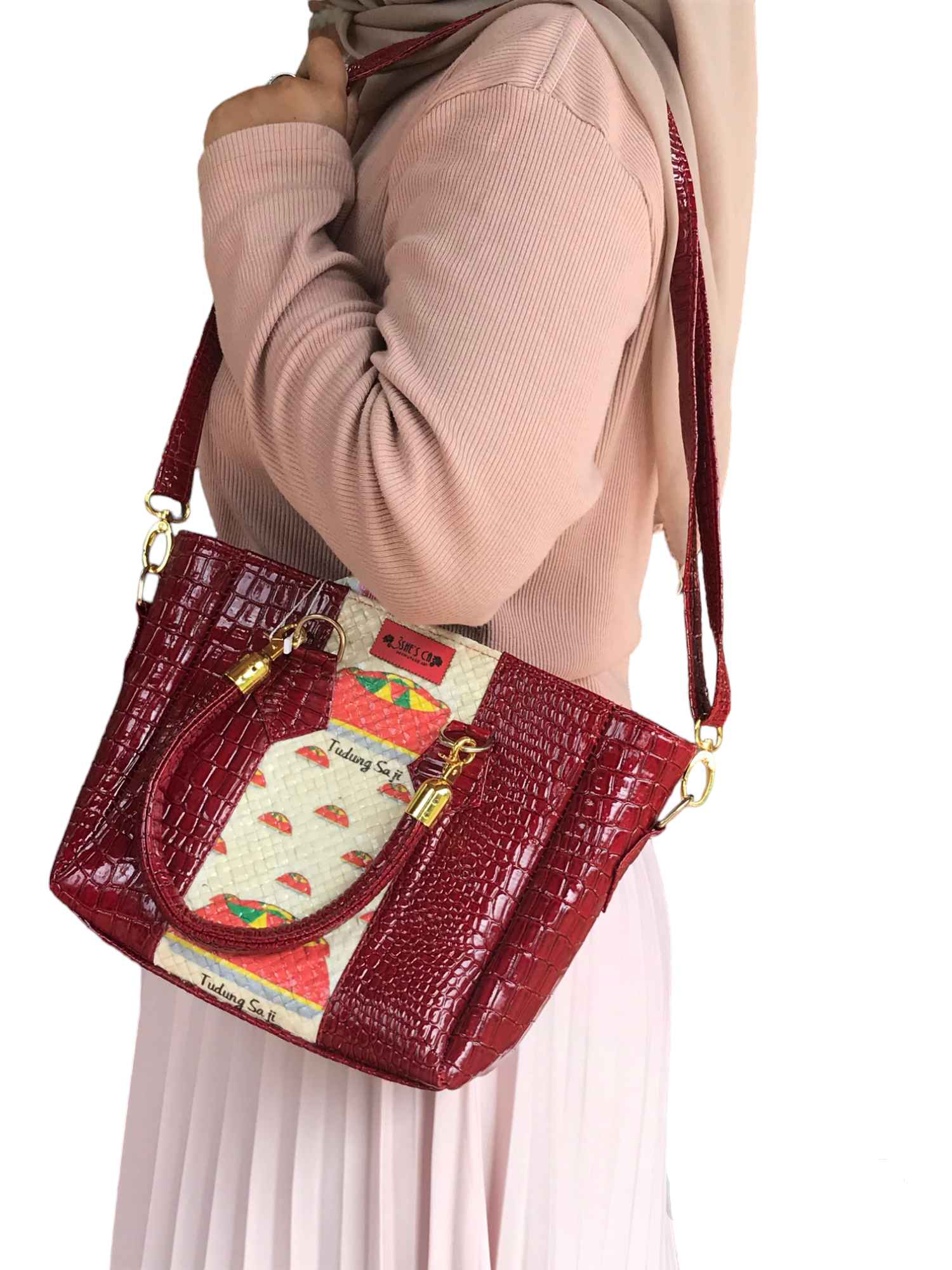 This bag is the result of a decoupage creation with a unique motif derived from patterned tissue on woven pandanus media with a combination of synthetic croco materials. Our innovation in this bag is to use tissue with the motif of Bangka Belitung's local wisdom, Tudung Saji Variasi. This bag has a small size with a zipper and long strap. Stock is available and can be ordered in large quantities with a PO system. And also can be costum for the motif.