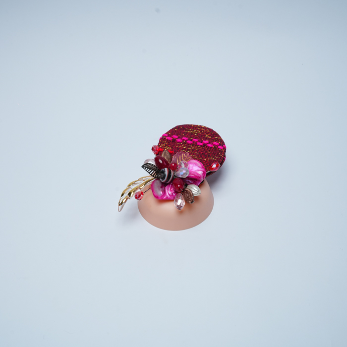 Material Type: – Kain ulos tradisional – Manik-manik batu alam dan akrilik warna merah, pink, dan ungu – Ornamen daun logam warna emas dan perunggu – Dasar bros dari kain, busa padat, dan peniti logam antikarat