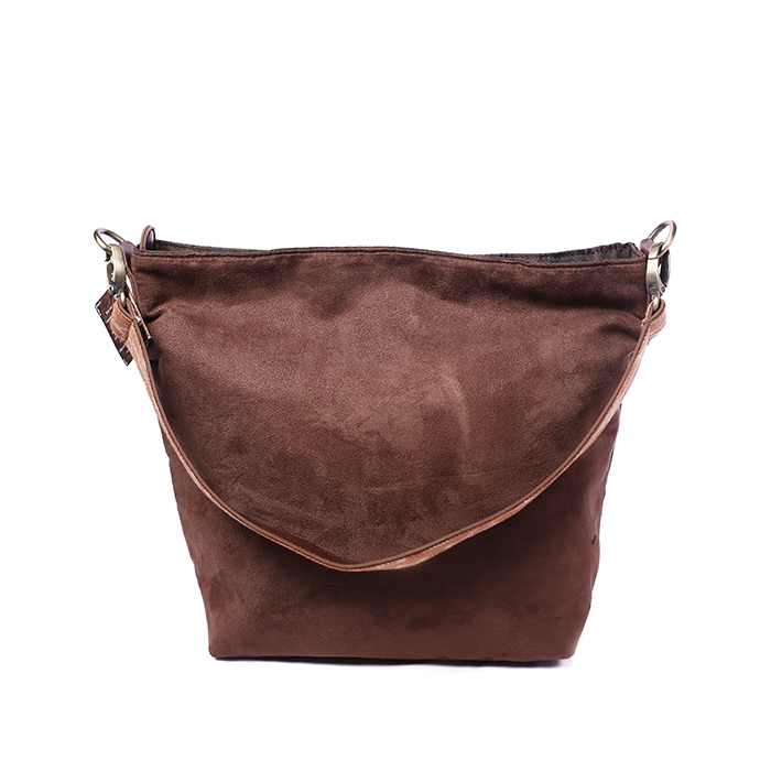 Simple handbag made of brown suede plus pieces of ikat woven fabric, great for traveling.