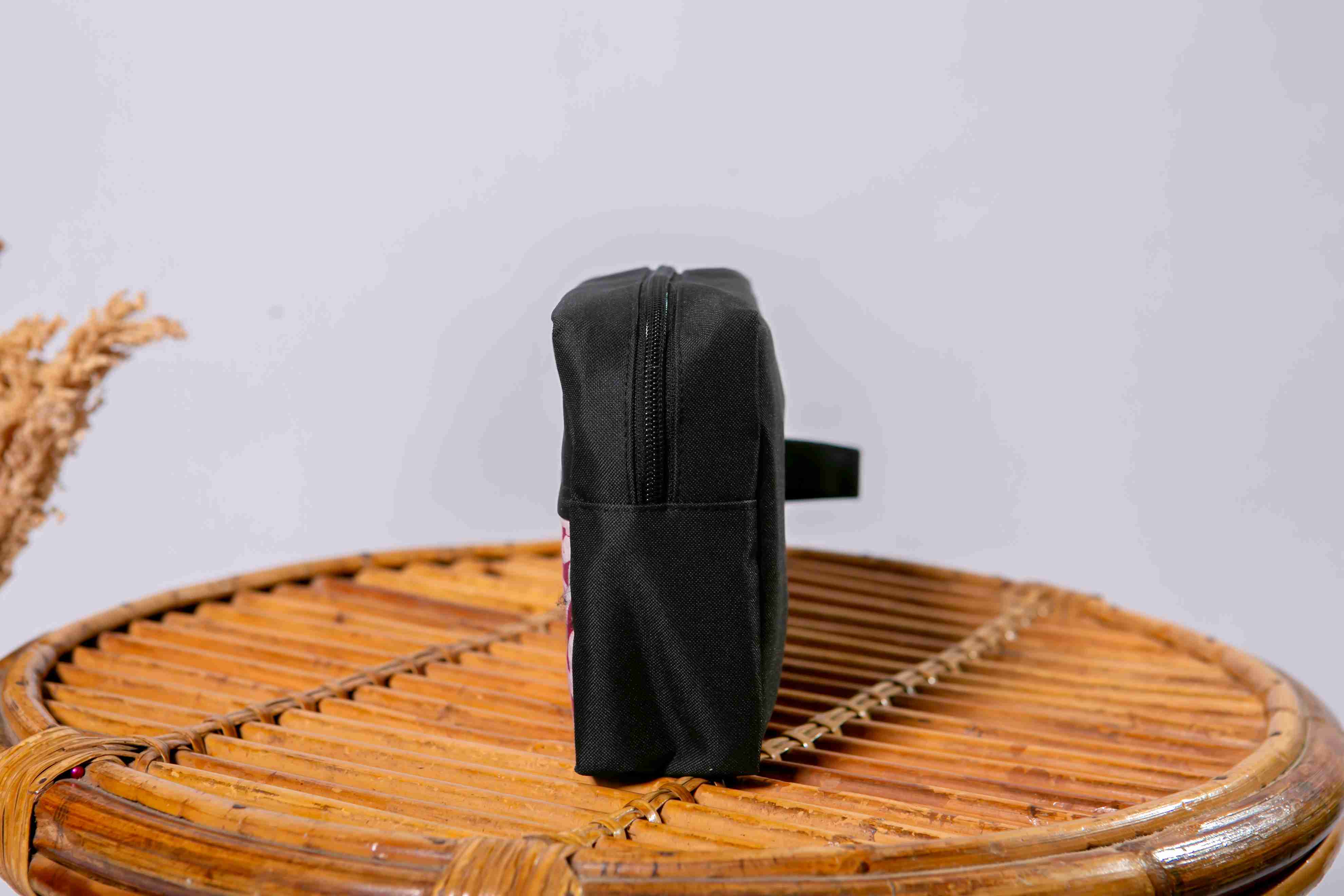 This batik pouch offers a modern yet practical design, made from a durable black canvas fabric paired with a stylish ethnic batik pattern on the front. It features a main zipper closure and an additional front zippered compartment, making it ideal for storing personal items like stationery, cosmetics, or travel essentials. Designed with a side handle for easy carrying, this pouch is perfect for everyday use or as a unique cultural souvenir from Indonesia.
