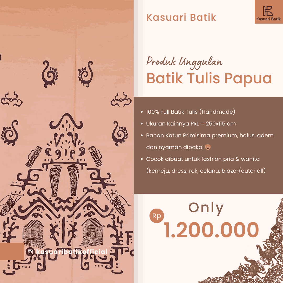 Founded in 2006 in Manokwari - West Papua, Kasuari Batik is one of the leading "Papua Batik & Tenun" fashion design houses and a symbol of exclusive ready-to-wear brand. Our design are produced carefully in traditional way by the hand of our experienced artisans. All of our products crafted with great attention to detail. Born from an inspiration that is coming from the culture, tradition, diversity of flora and fauna from Eastern Indonesia, Papua & West Papua. It's authentic, artsy and unique.