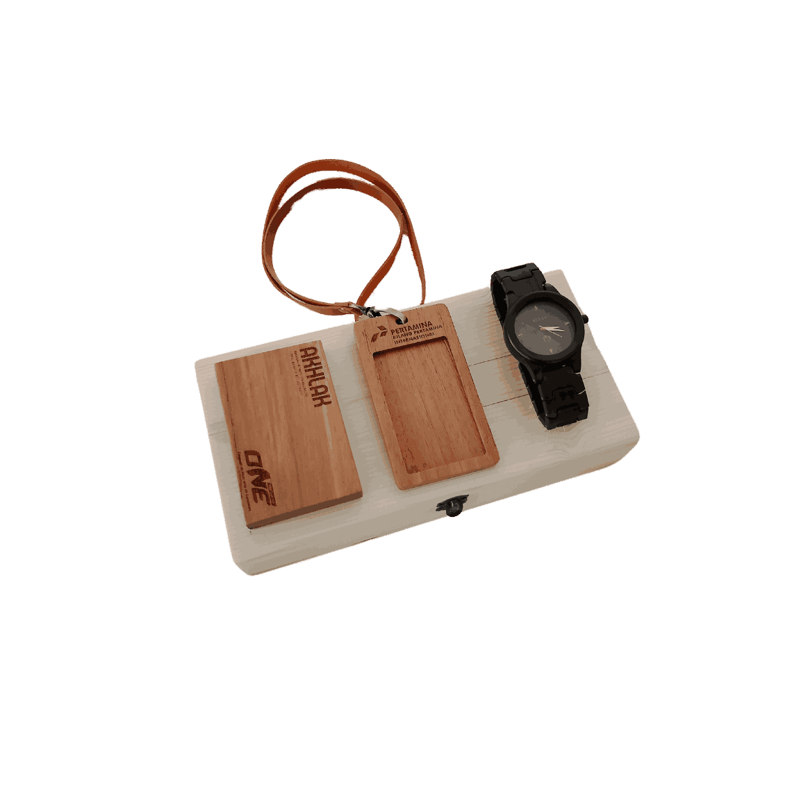 Paket bundling lanyard, box kartu nama dan jam tangan kayu Jethro Sono