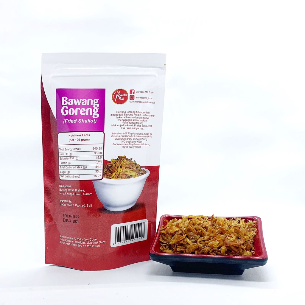 Mbrebes Mili Fried Shallots are made from Brebes Shallots, original without a mixture, Salt and selected palm oil to create the real taste of fried shallot with strong aroma, crunchy, and appetiting. This fried Shallot is very suitable for cooking and sprinkling of food so that the dishes is more tasty and delicious.