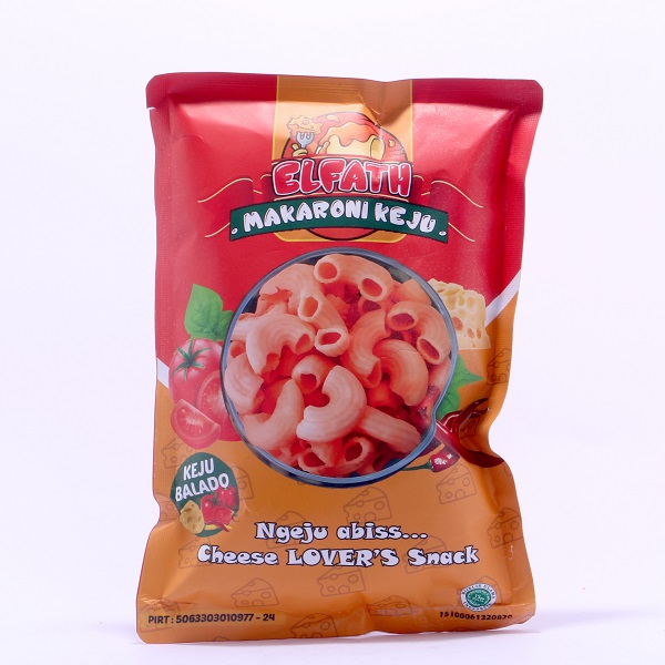 Elfath makaroni keju rasa keju balado merupakan camilan khas nusantara dengan kualitas terbaik. Camilan sehat bebas gluten ini dibuat langsung dari keju cheddar berkualitas. Penambahan bumbu khas sambal balado memberikan keunikan pada citarasa makaroni keju balado ini. Diolah tanpa menambahkan bahan pendawet dan diproses secara higienis dengan selalu mengedepankan mutu demi terjaganya kualitas produk.