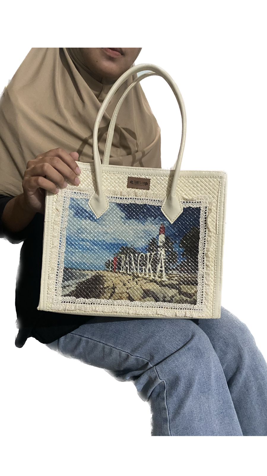 Tas ini merupakan hasil dari kreasi decoupage dengan keunikan di motifnya yang berasal dari tissue bermotif di atas media anyaman pandan. Inovasi kami di tas ini adalah dengan menggunakan tissue dengan motif kearifan lokal khas Bangka Belitung yaitu mercu suar di Tanjung Kalyan dengan tulisan I Love Bangka. Tas ini memiliki ukuran yang medium dan dilengkapi dengan resleting. Stok tersedia dan bisa dipesan dalam jumlah banyak dengan sistem PO. Serta bisa juga costum motif nya.