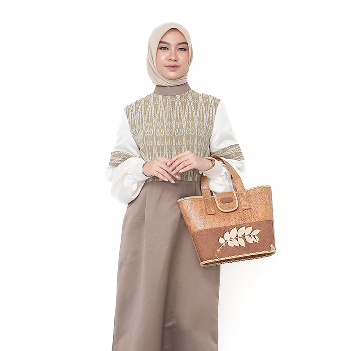 Berbahan dasar serat kulit kayu kapuak yang merupakan bahan Khas kearifan lokal Kalimantan dikombinasikan dengan kain ecoprin yang motif nya dihasilkan dari daun-daun yang segar.