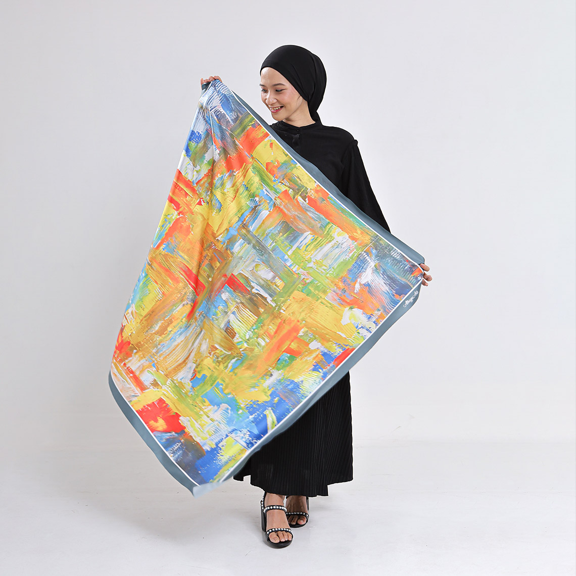Makna Motif: Terinspirasi kampung warna warni di kota Malang yang dilihatnya nampak seperti rumah yang bersusun Proses melukis menggunakan solet dan pisau pipih yang didapat saat membeli bolu