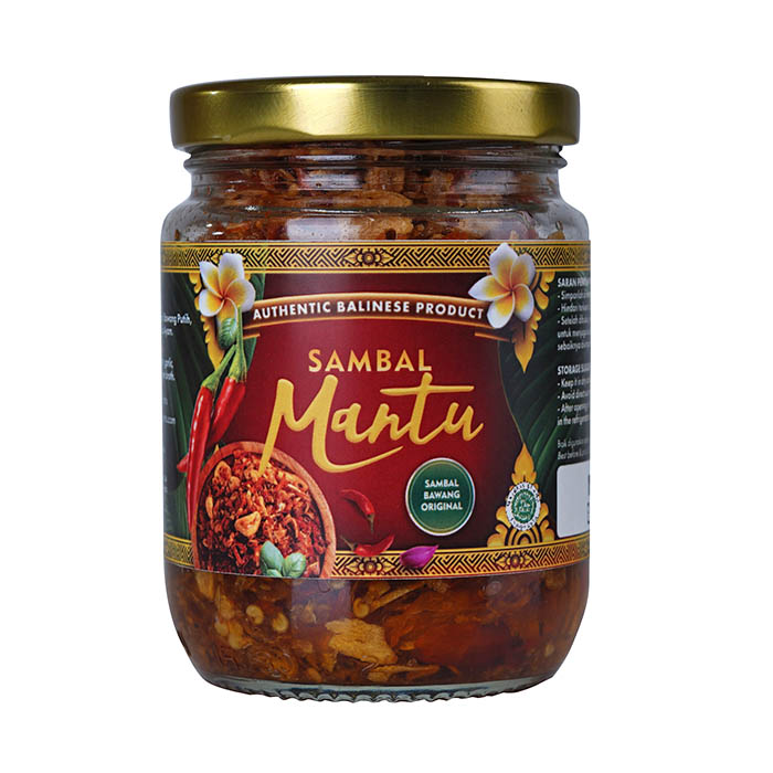 Sambal Mantu Varian Original memiliki level pedas STANDAR (tidak terlalu pedas). Diproduksi secara modern dengan menggunakan bahan-bahan berkualitas dan resep tradisional khas Bali. Dikemas dengan menggunakan botol kaca. Cocok digunakan sebagai salah satu oleh-oleh khas Bali, bisa juga digunakan pada saat traveling, ibadah haji, perjalanan dinas dan lain-lain. Masa Kadaluwarsa 4 bulan GURIH, CRISPY, TANPA MSG No PIRT 1115103010001-24 No Halal 08060011090920 Cara Penyimpanan - Simpanlah di tempat sejuk dan kering - Hindari terkena sinar matahari langsung - Setelah di buka jika dalam 5 hari sambal belum habis, untuk menjaga kualitas bahan dan rasa sambal sebaiknya disimpan di dalam lemari pendingin. Ukuran Produk 7cm X 6.5 cm X 9.5 cm Proses Pengiriman dijamin aman tidak pecah karena menggunakan bubble wrap sehingga aman sampai di tangan pembeli.