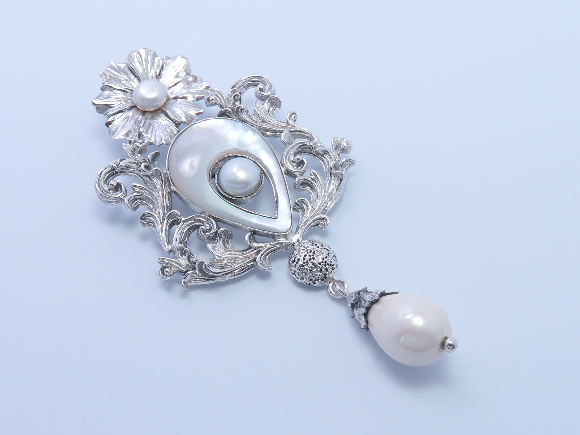 Silver Cosmos Brooch with White Pearl