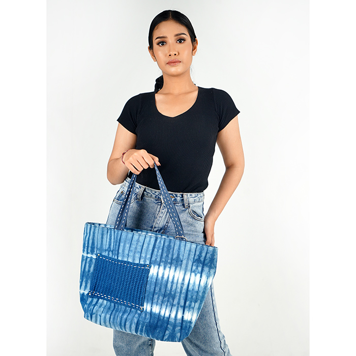 Jenis Bahan: Kain linen yang diwarnai dengan pewarna alami daun indigo dengan aplikasi sashiko