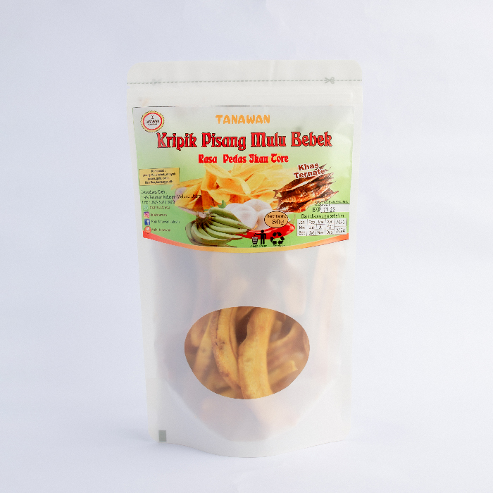 Keripik pisang mulu bebe merupakan produk tanawan yang dikreasikan dengan sambal khas Ternate (roa) dalam bentuk bubuk sehingga tidak perlu repot saat ingin makan pisang mulu bebe dan lebih praktis untuk disajikan sebagai cemilan.