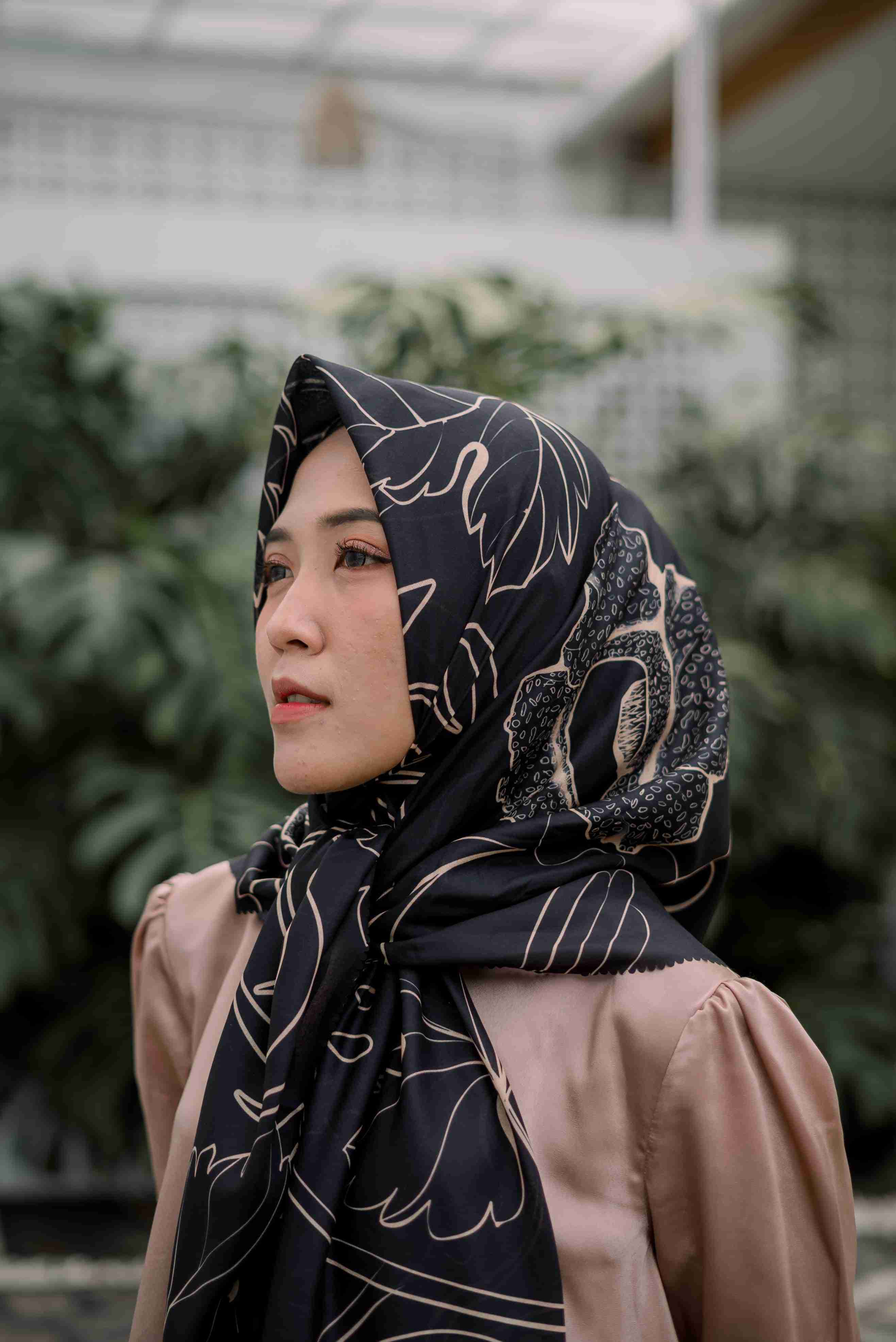 Makna Motif: Scarf bermotif bunga Rafflesia dengan perpaduan warna hitam dan gold memang tidak pernah gagal untuk memberikan kesan elegant dan hangat.