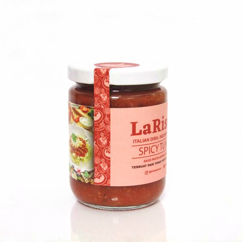 Saus Pasta Spicy Tuna LaRissso merupakan saus pasta varian pedas yang terbuat dari bahan-bahan alami yaitu tomat segar yang dipanen langsung dari para petani, ditambah dengan isian serpihan daging ikan tuna, kemudian dimasak menggunakan minyak canola ditambah dengan bumbu-bumbu juga perpaduan Italian herbs dan rempah lokal sehingga menciptakan rasa yang asam, segar, gurih dan sedikit pedas. Selain pasta saus ini juga cocok untuk olesan roti, pizza, cocolan kentang goreng, nachos, bahkan juga bias digunakan sebagai bumbu nasi goreng.