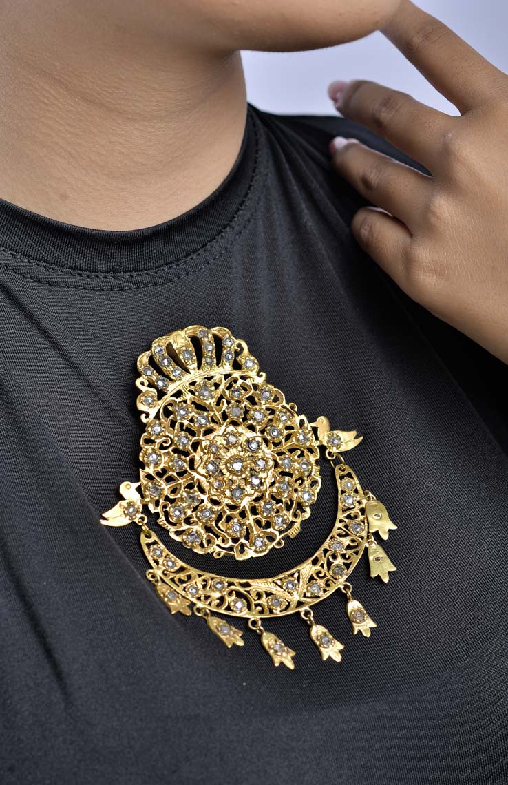 BROS BULAN MERUPAKAN BROS YANG TERBUAT DARI BAHAN TEMBAGA YANG DI LAPIS EMAS, REPLIKA BROS PENINGGALAN KHAS PALEMBANG YANG MENGGUNAKAN PERMATA KULIT INTAN YANG PROSES PEMASANGANNYA MENGUNAKAN METODE HANDMADE TATAH TEMPEL