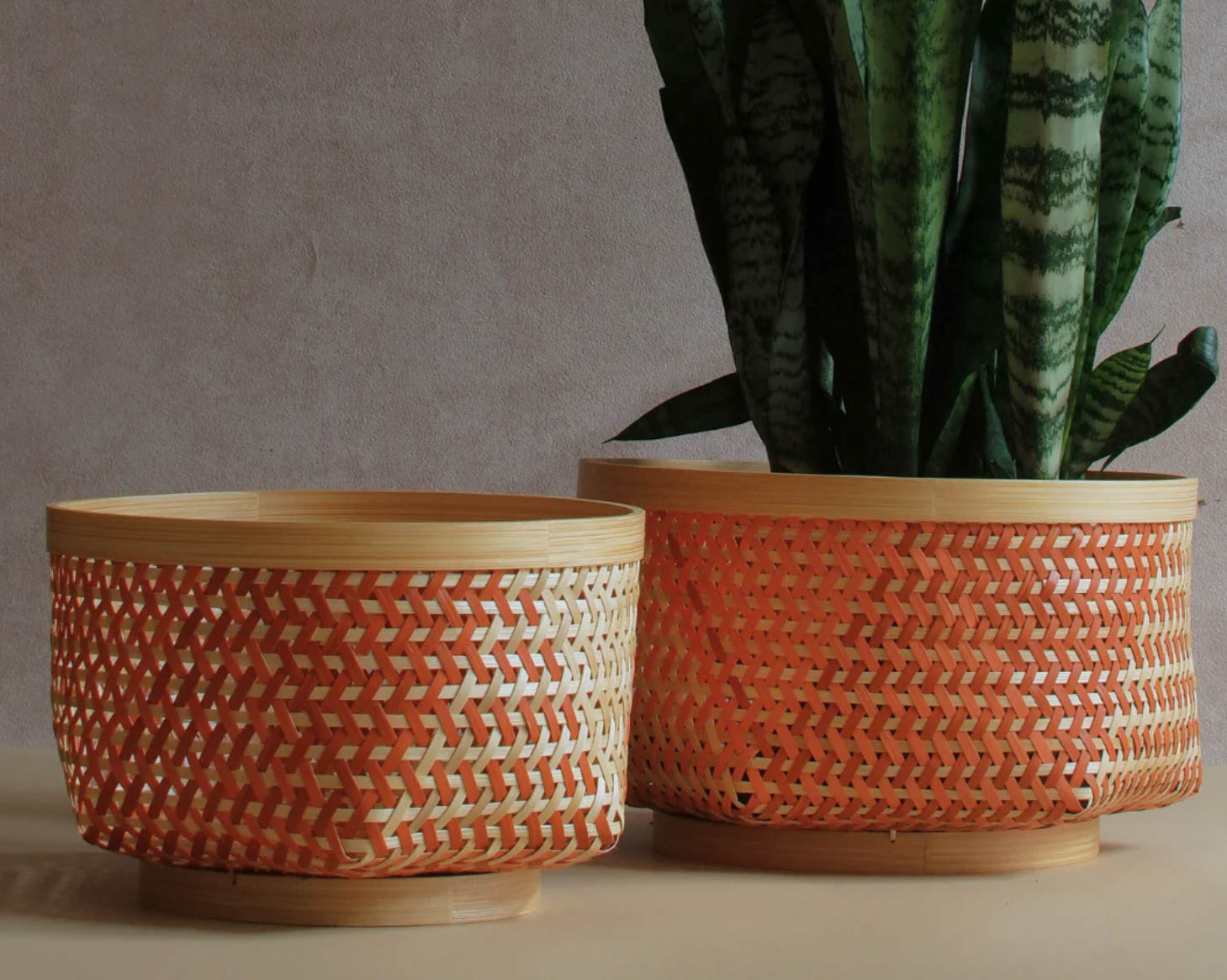 Keranjang bulat berwarna terracotta, ideal untuk pot tanaman atau menyimpan berbagai objek di rumah Anda