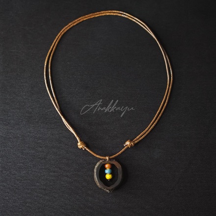 Jenis Bahan: Liontin luar : Kemiri; Liontin Dalam : 3 biji Keramik; Tali : Kulit Sintetis