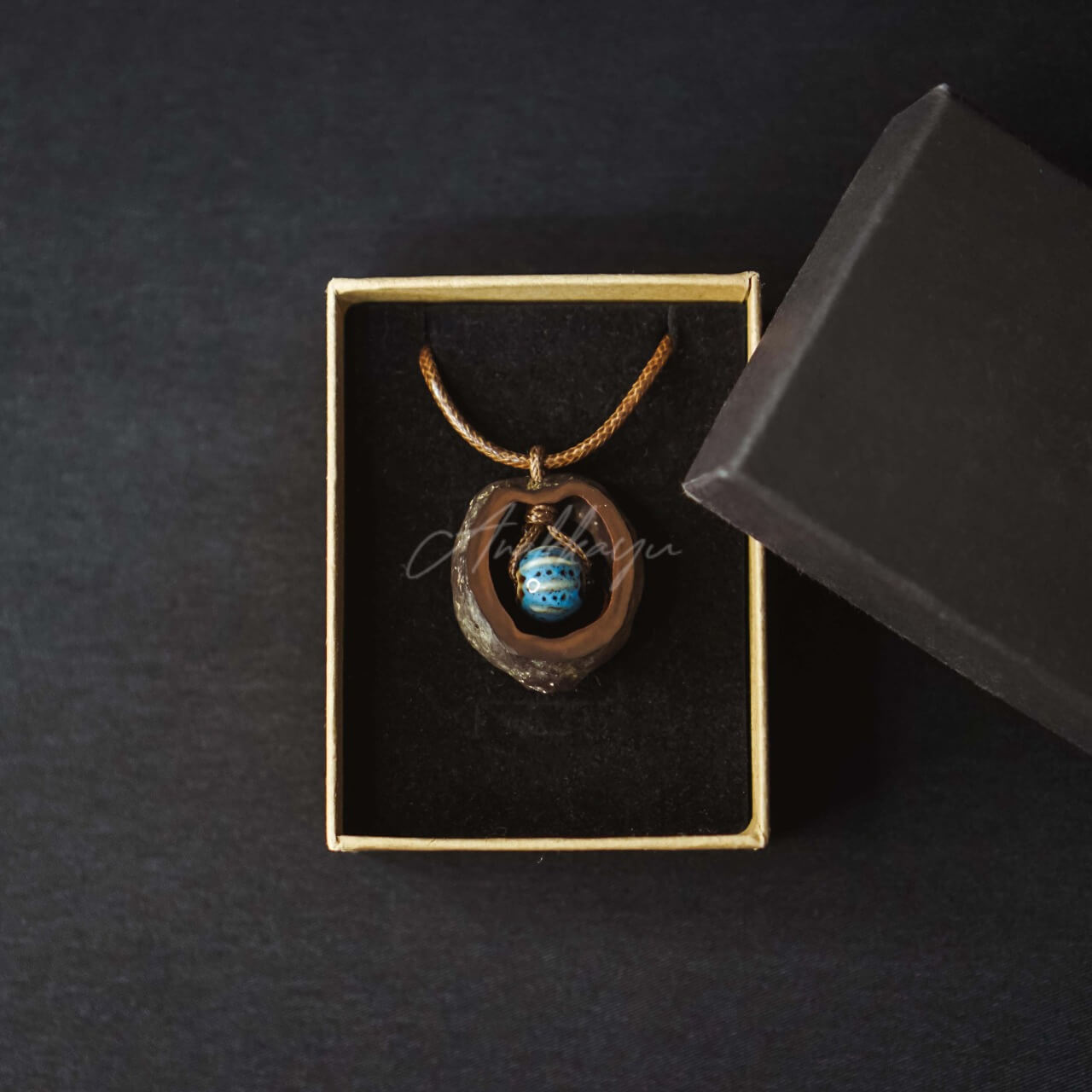 Jenis Bahan: Liontin luar : Kemiri; Liontin Dalam : Keramik; Tali : Kulit Sintetis
