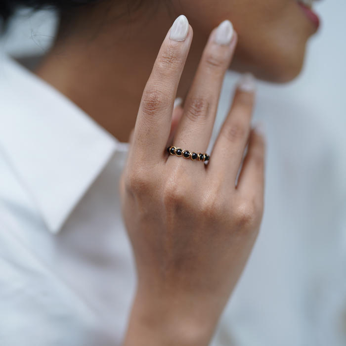 Cincin handmade berdesain lingkaran penuh, dirangkai dengan kawat tembaga emas dan kristal pilihan yang memantulkan kilau elegan. Menggunakan teknik twist wrapping, cincin ini menghadirkan tampilan sederhana namun berkelas. Cocok dikenakan sendiri sebagai statement lembut, atau dipadukan dengan cincin lain sebagai stacking ring yang manis.